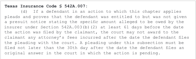 Under Chapter 542A, the failure to give pre-suit notice when required may cause the attorney to lose the right to recover some attorney fees.