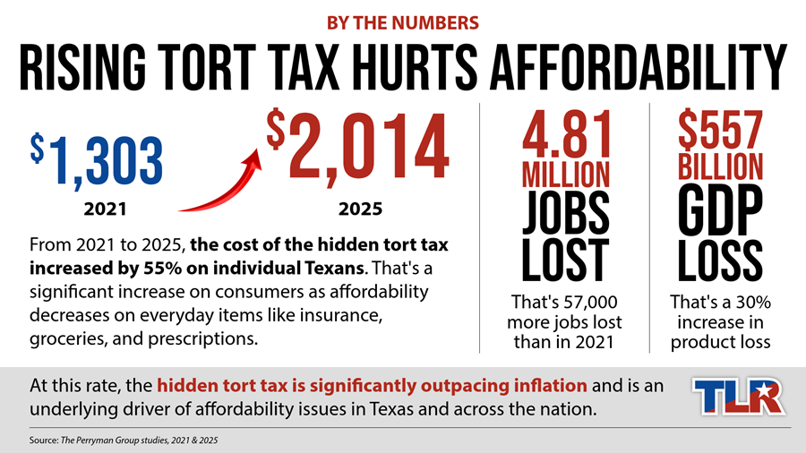 As other states begin to champion and pass lawsuit reforms, Texas is still feeling the burden of the rising tort tax. A comparative analysis of studies from The Perryman Group in 2021 and 2025 show inflation being outpaced significantly by a 55% increase in the hidden tort tax. In addition to hurting affordability for Texans, frivolous lawsuits are also costing millions of jobs and billions in economic output each year.
